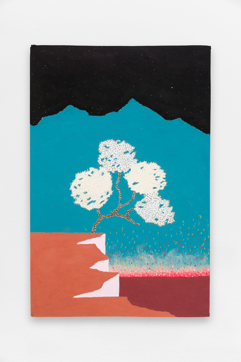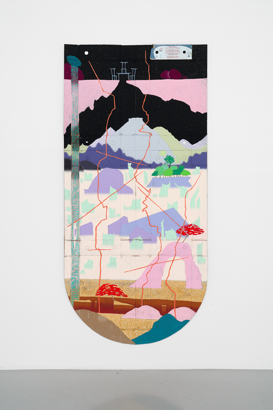 Alors que les expéditions coloniales faisaient des paysages exotiques un trope populaire dans l’art européen, Disundi donne une tournure différente à ses paysages luxuriants, montagnes, arbres et fronts de mer. Dans les ombres de ses décors nocturnes, on distingue des objets sculpturaux composés de bâtonnets en forme de membres longilignes qui réinventent la forme des structures suspendues utilisées pour sécher le poisson. D’une surface de carton de makayabu — qui porte les souvenirs d’une histoire de subjugation — Beau Disundi fait apparaître de nouveaux imaginaires. Avec leur perspective plate et leurs couleurs vives, ses peintures transmettent une douceur rappelant la peinture japonaise Sansui (de paysage) ; et elles nous plongent dans le type de configurations spéculatives que l’on pourrait trouver dans les paysages urbains futuristes de Bodys Isek Kingelez. Disundi transforme le carton de makayabu en un socle pour l’émergence de nouvelles façons de voir le moi en relation avec le monde.
