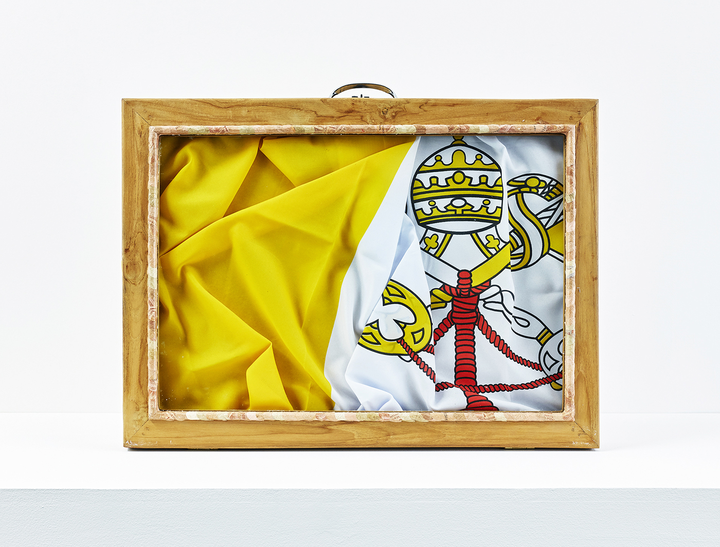 Wood, glass, Benin banknotes, textile flag